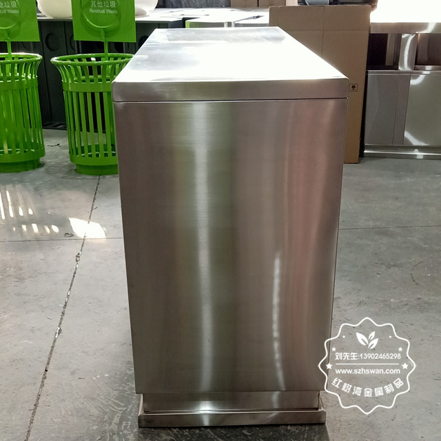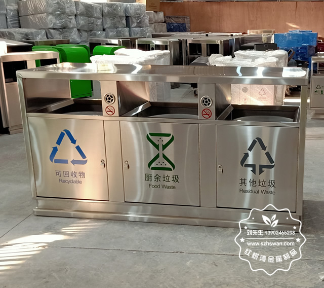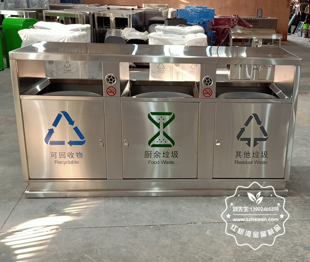 產品材質:戶外方形三分類不銹鋼垃圾箱采用201#,202#,304#優質不銹鋼材料模壓成型,堅固耐用;內外表面光潔,減少垃圾殘留,易于清潔;配置鍍鋅板內桶,便于垃圾清倒;