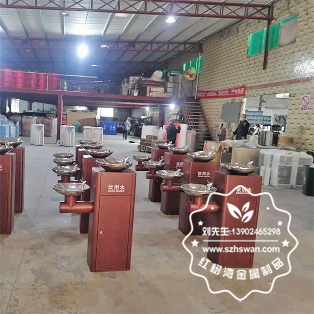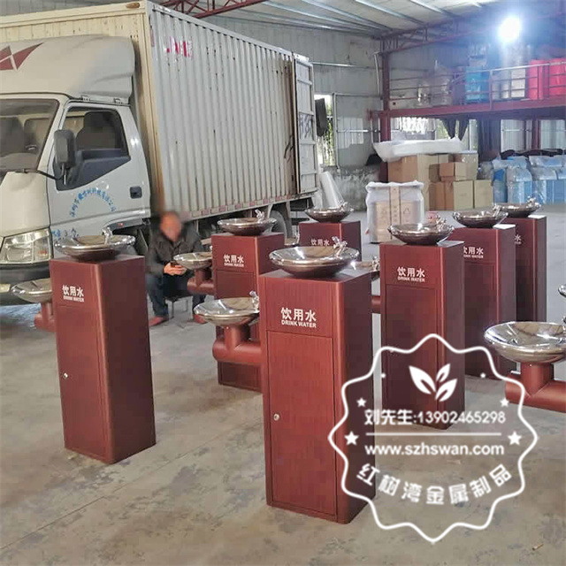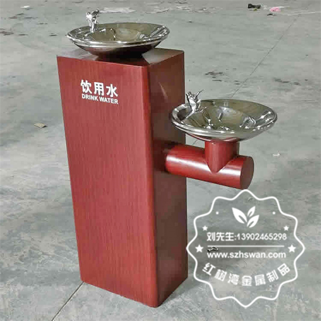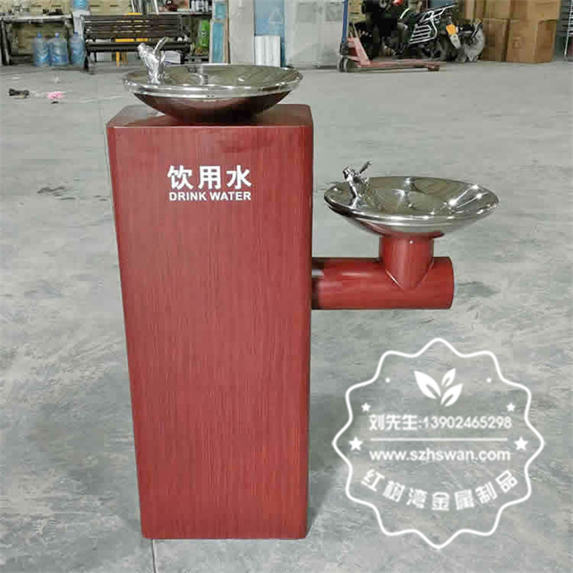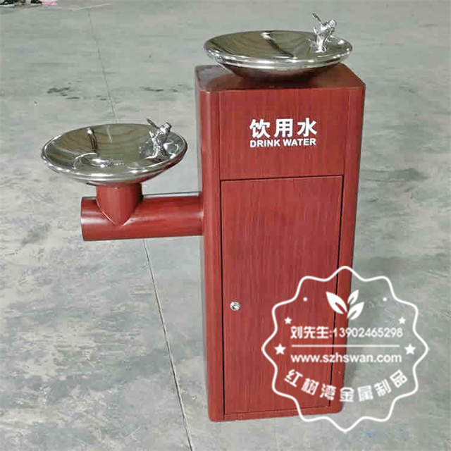 產品材質:戶外景區公共轉木紋胡桃色不銹鋼飲水機采用了304不銹鋼板制作而成,雙盆方形底座設計,金屬表面胡桃色轉木紋,雙盆不銹鋼本色亮光,箱體油墨絲印飲水機中英文文字,可以使用三角鑰匙開門,內置帶過濾系統。