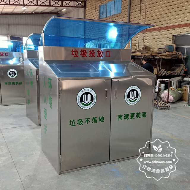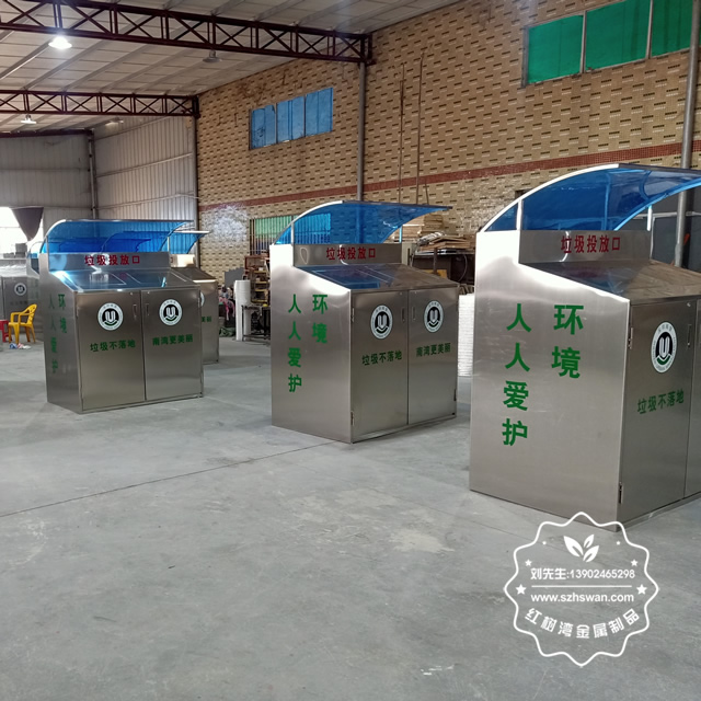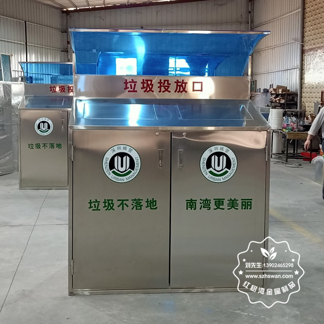 產(chǎn)品材質(zhì):帶雨棚戶外不銹鋼分類垃圾桶采用201#,202#,304#優(yōu)質(zhì)不銹鋼材料模壓成型,堅固耐用;內(nèi)外表面光潔,減少垃圾殘留,易于清潔;配置鍍鋅板內(nèi)桶,便于垃圾清倒;
