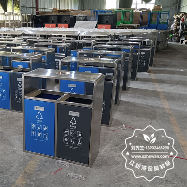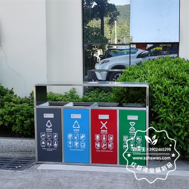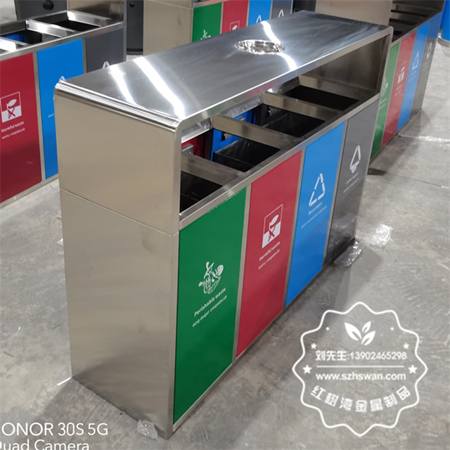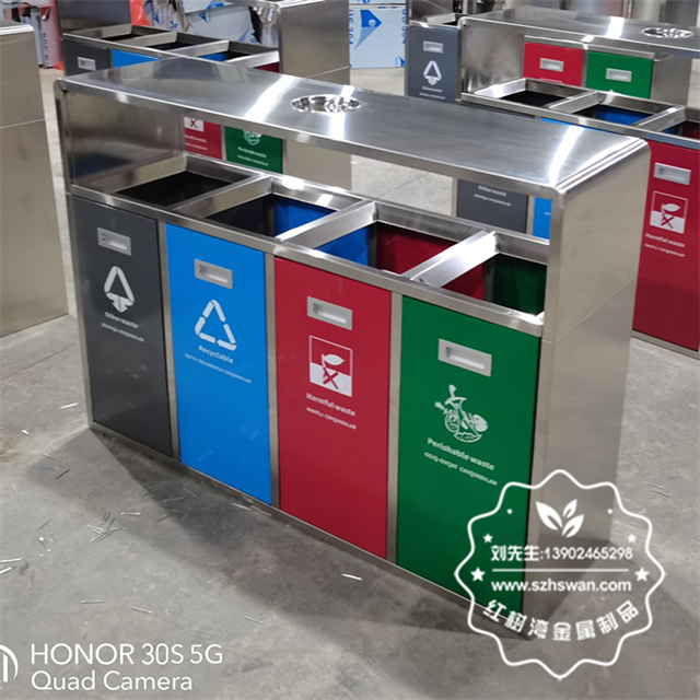 產品材質:四色分類果皮不銹鋼垃圾箱采用201#,202#,304#優質不銹鋼材料模壓成型,堅固耐用;內外表面光潔,減少垃圾殘留,易于清潔;配置鍍鋅板內桶,便于垃圾清倒;