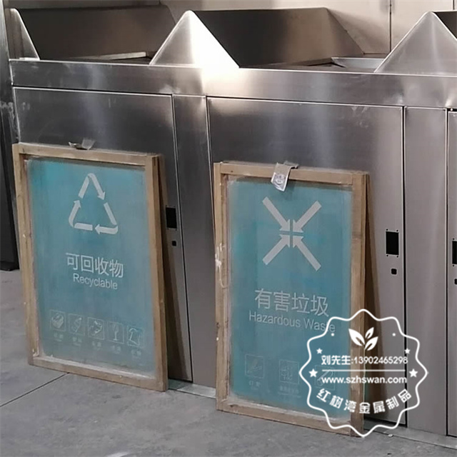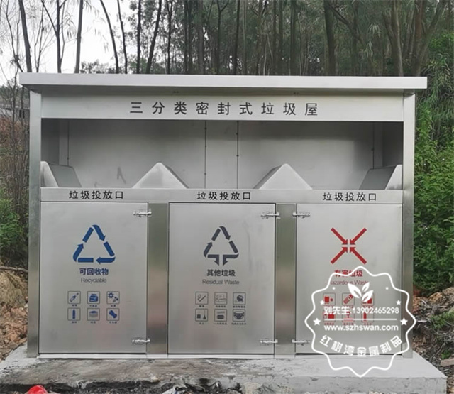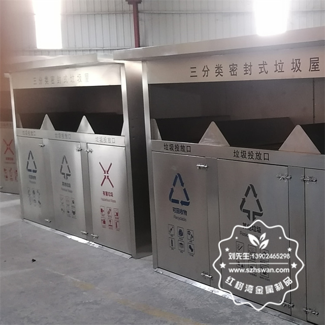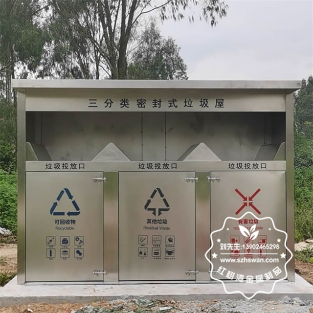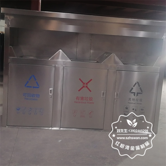 產(chǎn)品材質(zhì):戶外密閉式三連體不銹鋼分類垃圾屋采用201#,202#,304#優(yōu)質(zhì)不銹鋼材料模壓成型,堅(jiān)固耐用;內(nèi)外表面光潔,減少垃圾殘留,易于清潔;配置鍍鋅板內(nèi)桶,便于垃圾清倒;