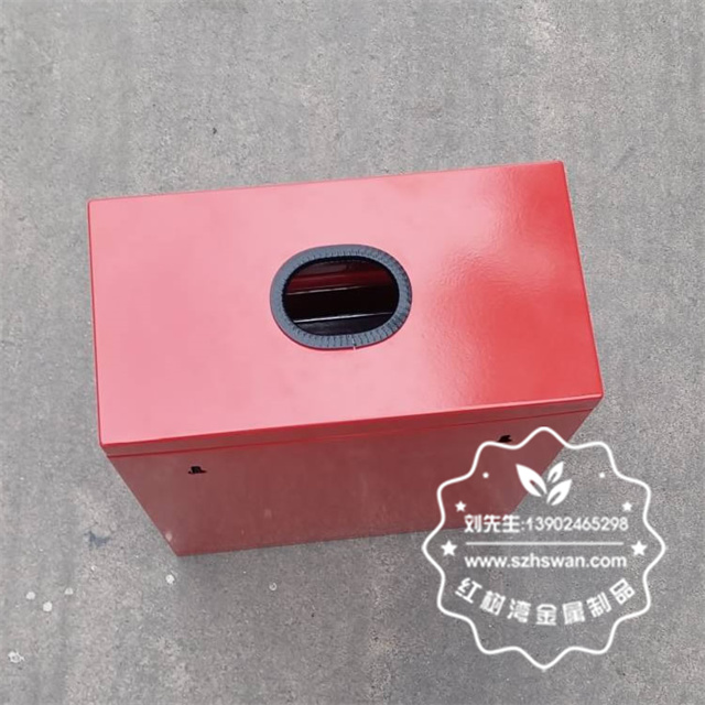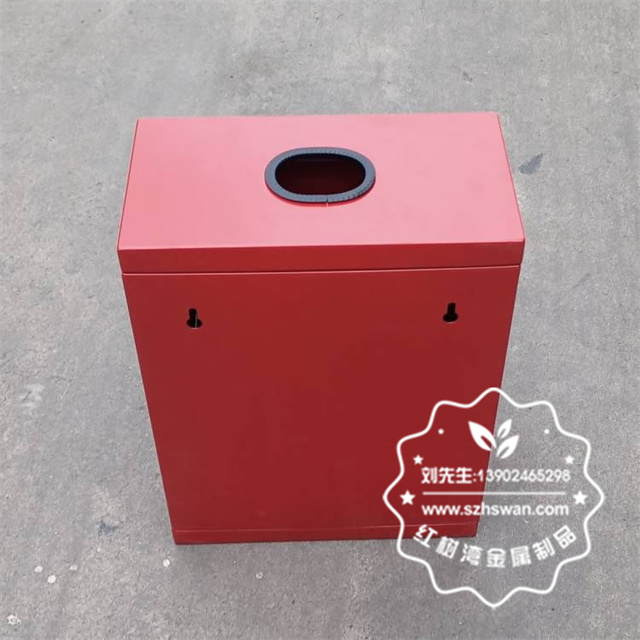 戶外方形掛壁式紅色烤漆不銹鋼有害垃圾桶采用優質304不銹鋼無縫焊接成型,投口模具沖壓成型,邊角精細打磨拋光圓滑不割手,高檔大氣。