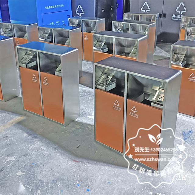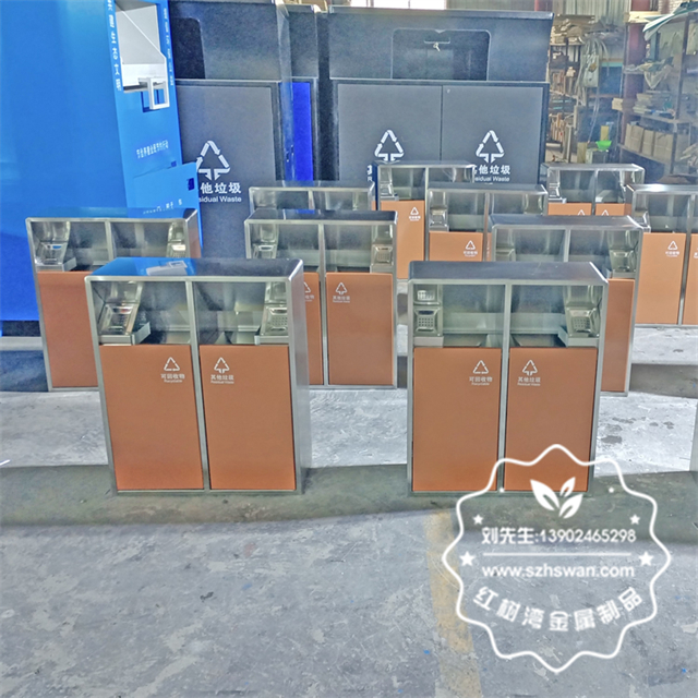 產品材質:戶外小區噴粉不銹鋼兩分類垃圾桶采用201#,202#,304#優質不銹鋼材料模壓成型,堅固耐用;內外表面光潔,減少垃圾殘留,易于清潔;配置鍍鋅板內桶,便于垃圾清倒;