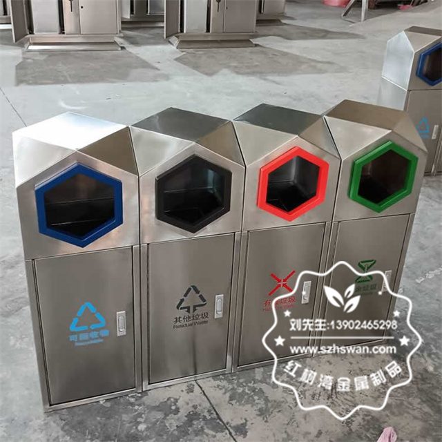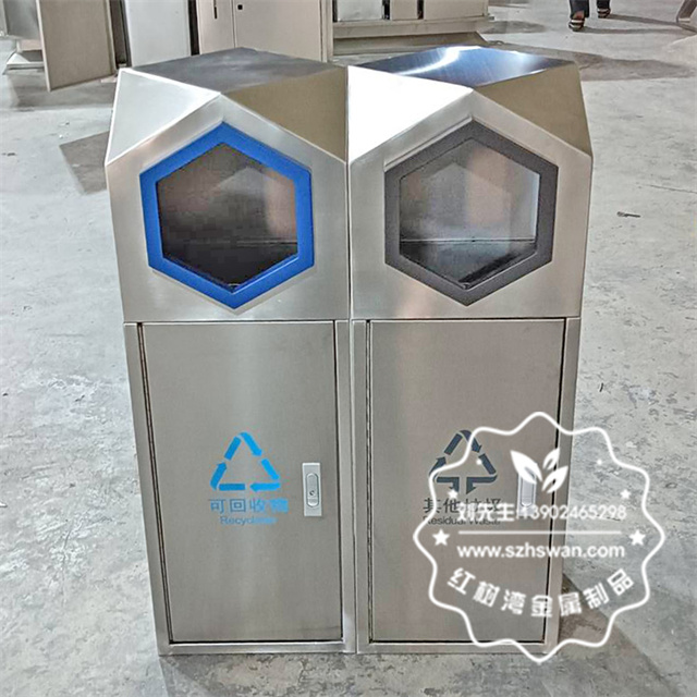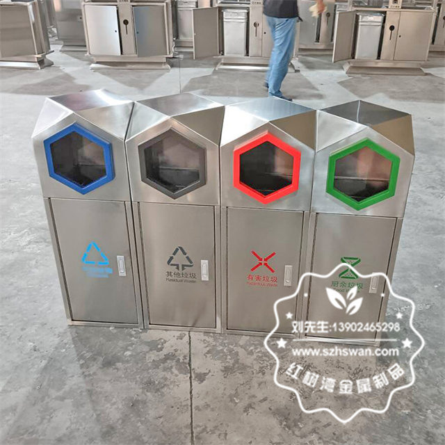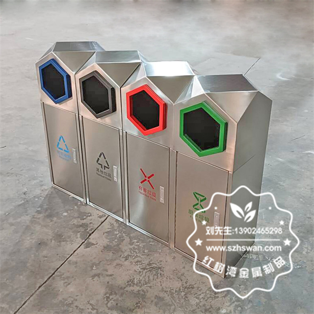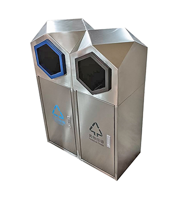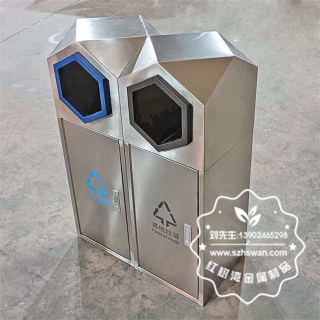 產品材質:室外園林組合式菱形不銹鋼分類垃圾桶采用201#,202#,304#優質不銹鋼材料模壓成型,堅固耐用;內外表面光潔,減少垃圾殘留,易于清潔;配置鍍鋅板內桶,便于垃圾清倒;
