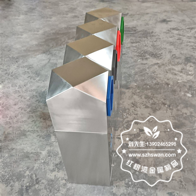 室外園林組合式菱形不銹鋼分類垃圾桶采用優質201不銹鋼無縫焊接成型,投口模具沖壓成型,邊角精細打磨拋光圓滑不割手,高檔大氣。
