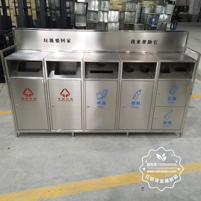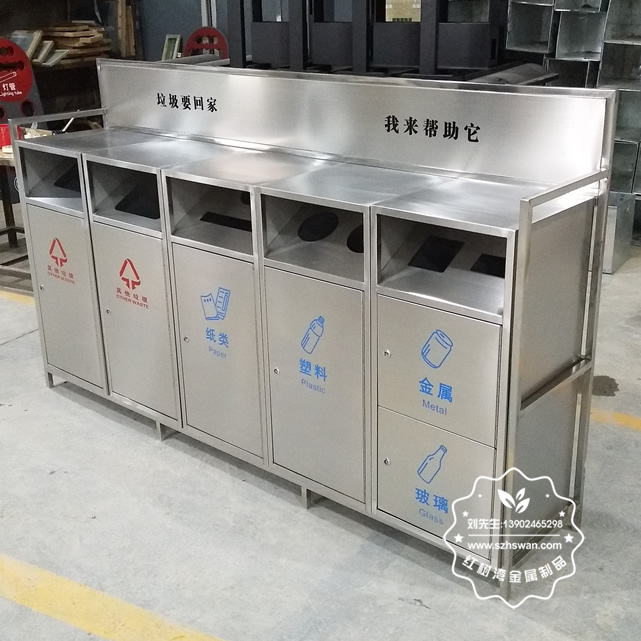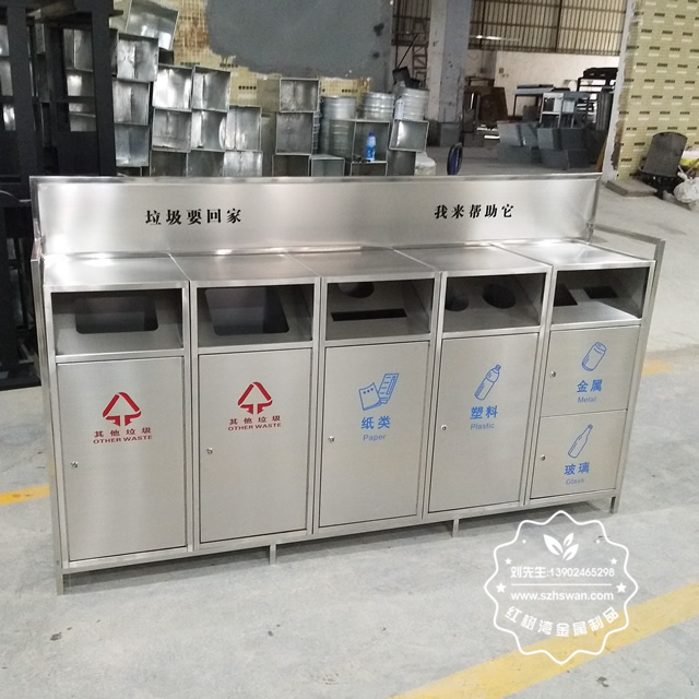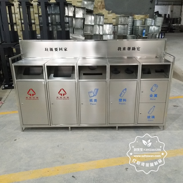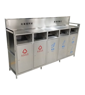 戶外大型五分類不銹鋼垃圾箱采用優質201不銹鋼無縫焊接成型,投口模具沖壓成型,邊角精細打磨拋光圓滑不割手,高檔大氣。