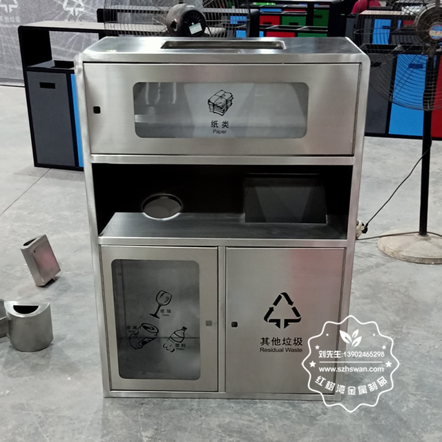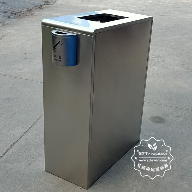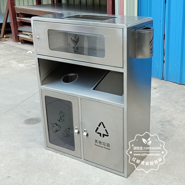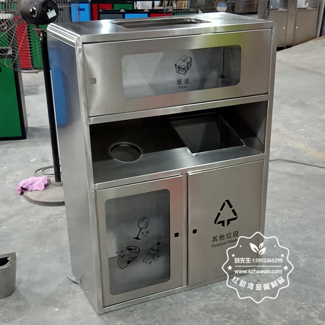 產品材質:戶外透明不銹鋼分類垃圾箱采用201#,202#,304#優質不銹鋼材料模壓成型,堅固耐用;內外表面光潔,減少垃圾殘留,易于清潔;配置鍍鋅板內桶,便于垃圾清倒;