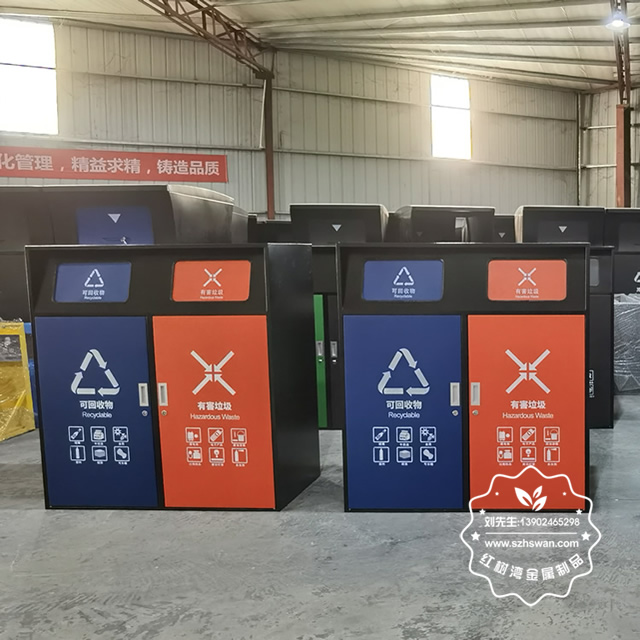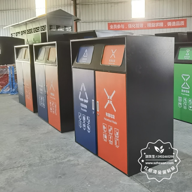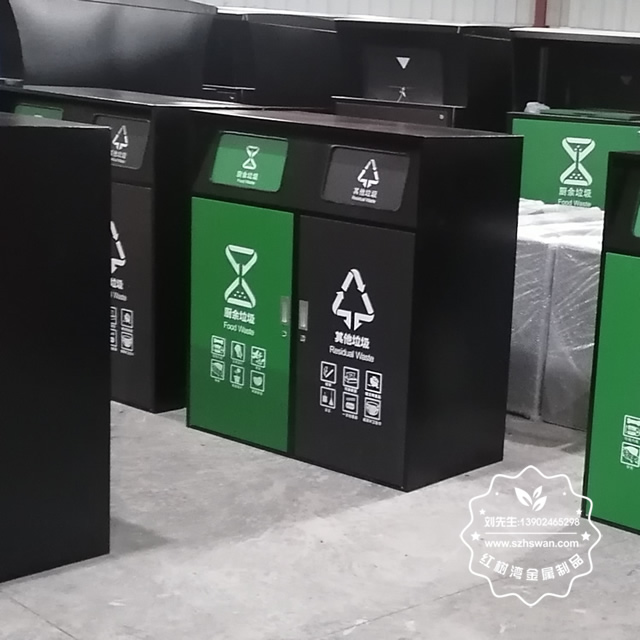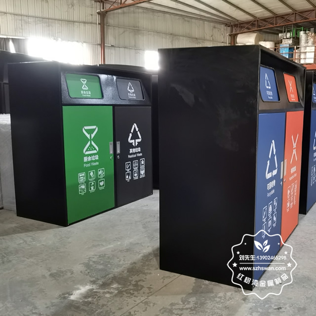 小區有蓋鍍鋅板分類垃圾桶采用優質冷軋鋼經剪鈑折彎焊接打磨等工藝,表面經過除油防銹處理后,再進行酸洗磷化防腐防銹。