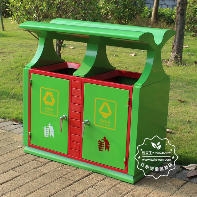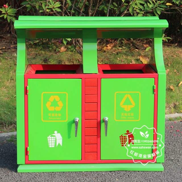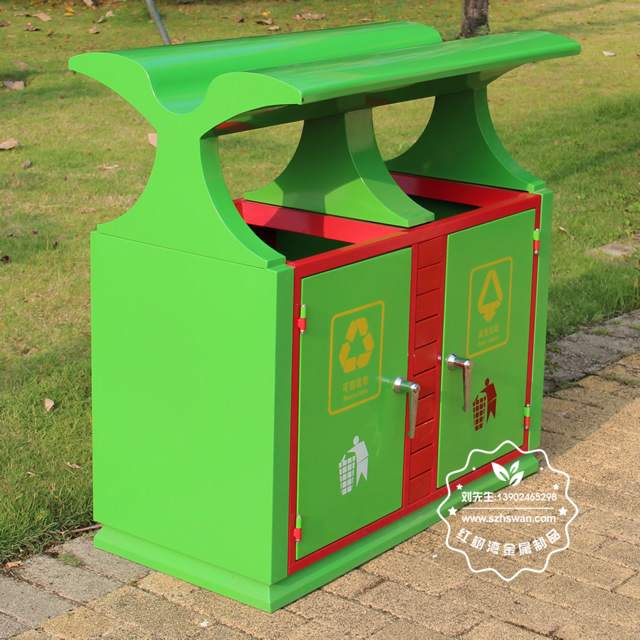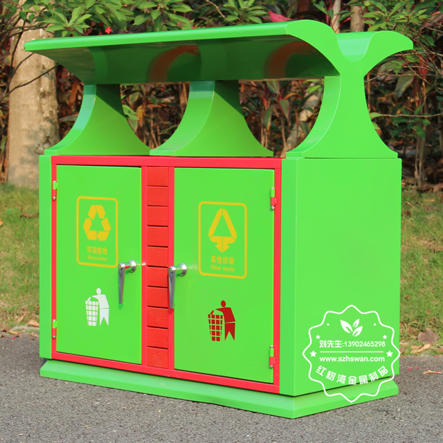 產品材質:戶外園林雙分類鋼制垃圾箱表面經過除油、噴砂防銹處理后,再進行酸洗磷化處理;表面清理后整體進行靜電噴涂或烤漆處理,靜電噴涂是經過流水線高溫固化爐固化后再出爐冷卻,漆面色澤耐久,防腐防銹;