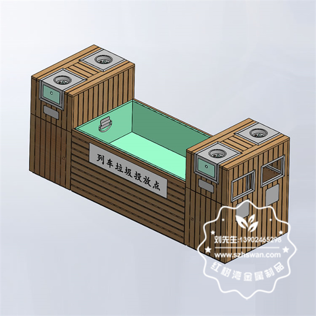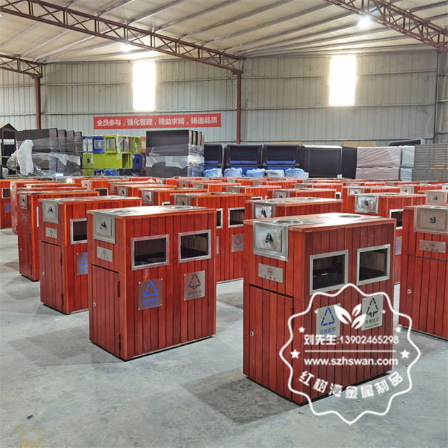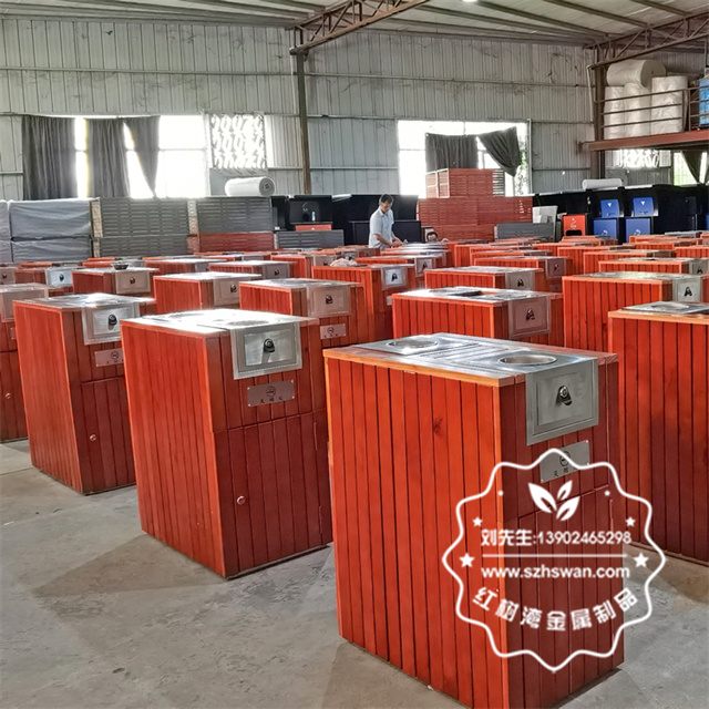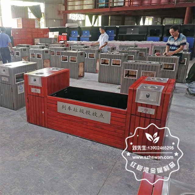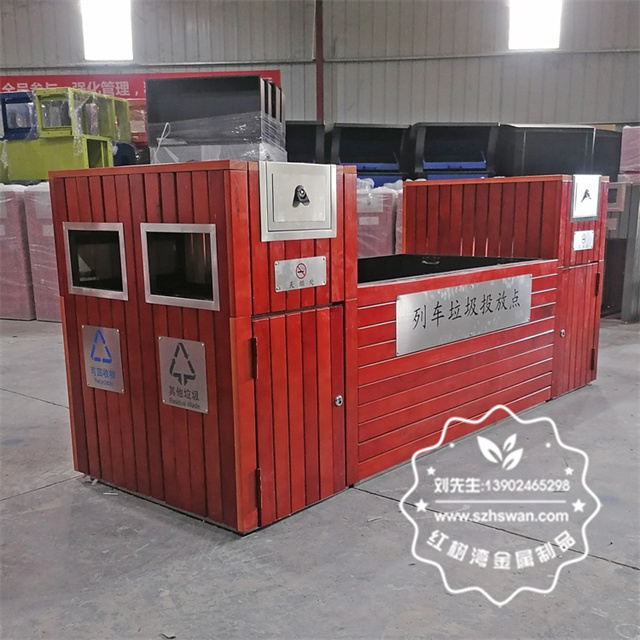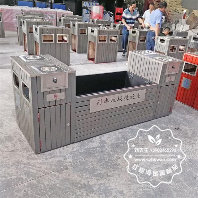 產品材質:高鐵站環衛連體組合鋼木分類垃圾桶鋼木部分可選用優質進口山樟木、防腐木或塑木,經防腐烘干處理后加工成型。桶身框架采用冷軋鋼板加工,表面經酸洗磷化噴塑處理組裝而成,使其戶外耐候持久,防腐防蛀不變形等優點;