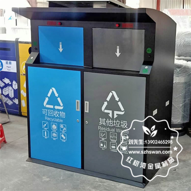 產(chǎn)品材質(zhì):戶外社區(qū)智能感應(yīng)鍍鋅板分類垃圾桶表面經(jīng)過除油、噴砂防銹處理后,再進行酸洗磷化處理;表面清理后整體進行靜電噴涂或烤漆處理,靜電噴涂是經(jīng)過流水線高溫固化爐固化后再出爐冷卻,漆面色澤耐久,防腐防銹;