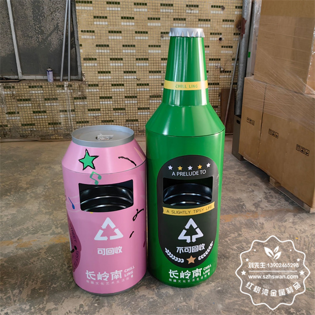 產品材質:戶外啤酒瓶造型鍍鋅板鐵皮垃圾桶采用優質冷軋鋼經除油-除銹-表調-磷化處理后,表面采用汽車靜電粉末經過180~220℃高溫烤漆,使粉末熔化黏附在金屬表面,雙層防銹,漆面色澤耐久;