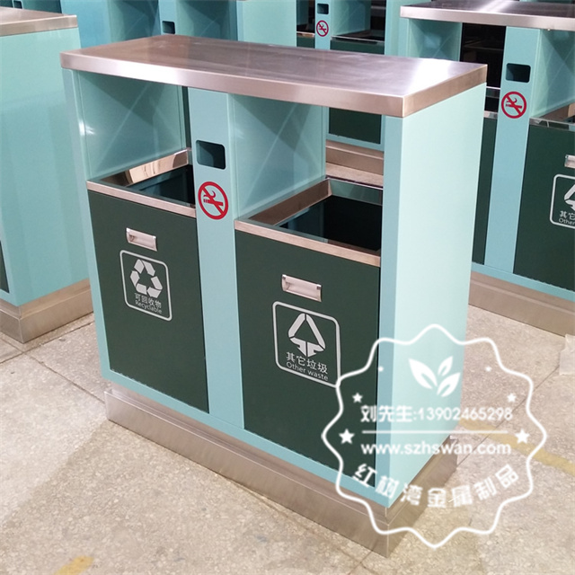 景區(qū)不銹鋼多分類垃圾桶:這一款戶外垃圾桶選用優(yōu)質(zhì)不銹鋼板裁剪、壓制、折彎后再焊接而成型;頂部弧度設(shè)計(jì),桶身精致拉手,頂部設(shè)置煙灰缸,加厚雙層底座垃圾箱上,正面釘著一塊宣傳牌:“講衛(wèi)生,愛清潔,垃圾入箱。"白底紅字,十分醒目。