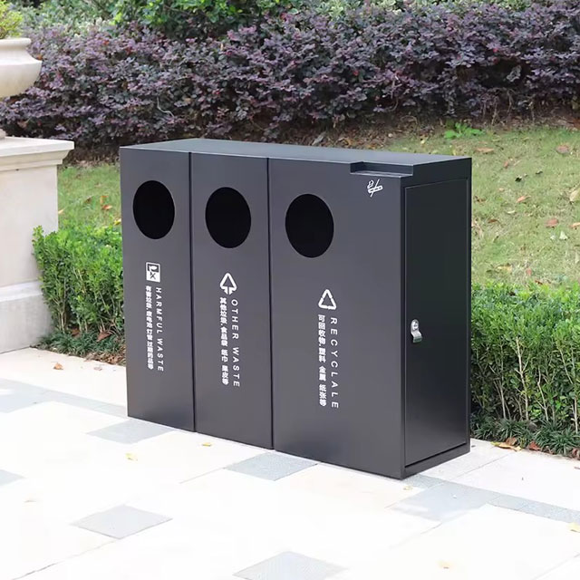 其廣泛的適用性使其成為各類戶外場所的理想選擇。在城市街道上,它為行人提供便捷的垃圾分類服務,助力城市保持整潔美觀;在公園、海濱浴場等休閑場所,它與自然景觀相得益彰,引導游客養成良好的環保習慣;在學校、醫院等公共機構周邊,它以高效的分類功能和衛生的設計,維護著公共環境的健康與安全。  這款出口級戶外黑色噴粉不銹鋼三分類垃圾桶,將實用功能與美學設計完美結合,為戶外垃圾分類提供了卓越的解決方案。讓我們共同選擇它,為打造更美好的地球家園貢獻一份力量。如果你對這款垃圾桶感興趣,或者有任何關于垃圾分類的見解,歡迎在評論區留言分享,期待與你交流。