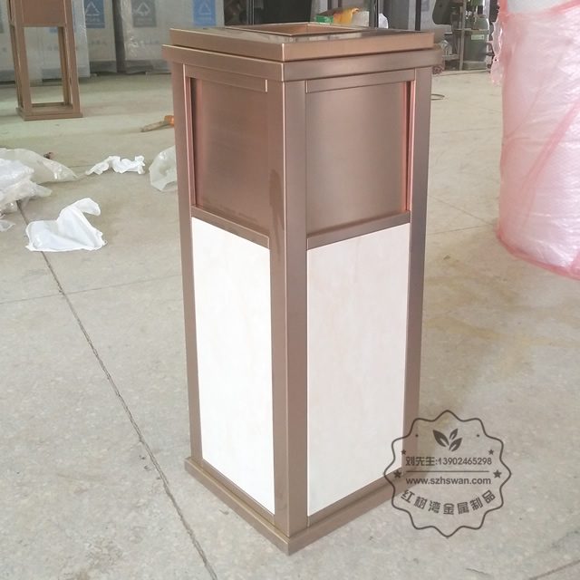 7、鈦金大理石垃圾桶:一般由不銹鋼板進行裁剪,折彎,焊接出結(jié)構(gòu),結(jié)構(gòu)鍍金色,在結(jié)構(gòu)四周裝置大理石。