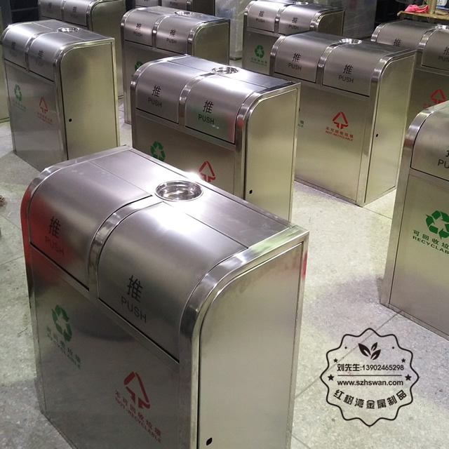這款雙筒不銹鋼垃圾桶型號為C183,尺寸規格:800*450*850mm,1個600元、50個550元、100個500元,左右兩邊側面開門可以取出內筒,環保果皮箱兩分類搖蓋式方形設計,頂部中心位置帶一個煙灰盅,垃圾箱正面絲印了可回收垃圾、不可回收垃圾,桶蓋絲網印刷一個推字,是我們紅樹灣金屬制品熱銷的一款產品。