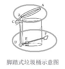 如圖所示,這樣的垃圾桶共有兩條杠桿,分別為杠桿ABC 和杠桿DEF。由圖可知杠桿ABC的支點為點C,A、B兩個都是力的作用點,A處為阻力(蓋子的重力)作用點,B處為動力作用點,這條杠桿是費力杠桿;