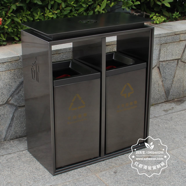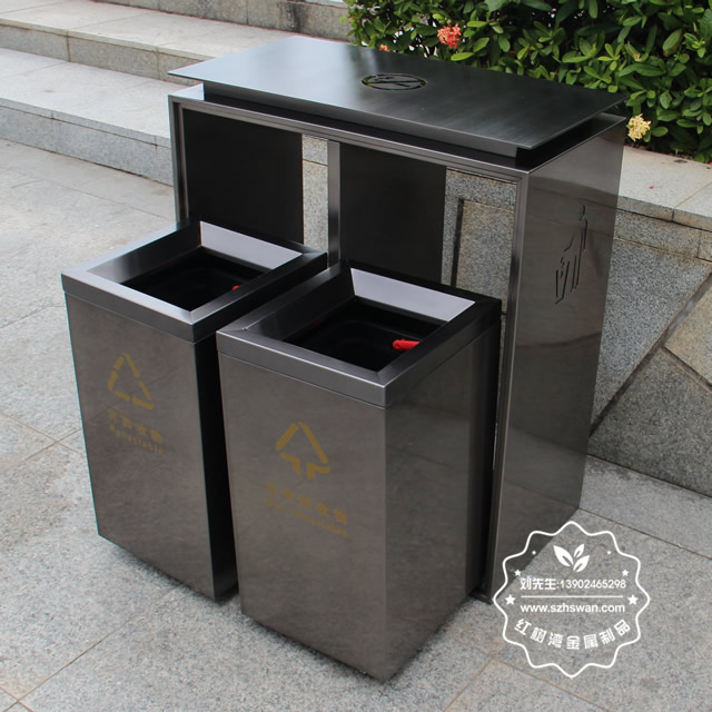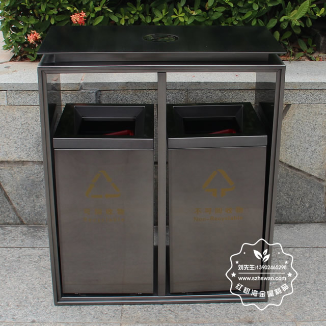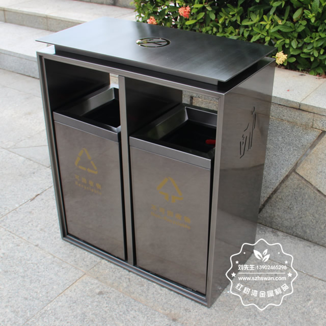 電梯口兩分類不銹鋼果皮箱采用優質201不銹鋼無縫焊接成型,投口模具沖壓成型,邊角精細打磨拋光圓滑不割手,高檔大氣。