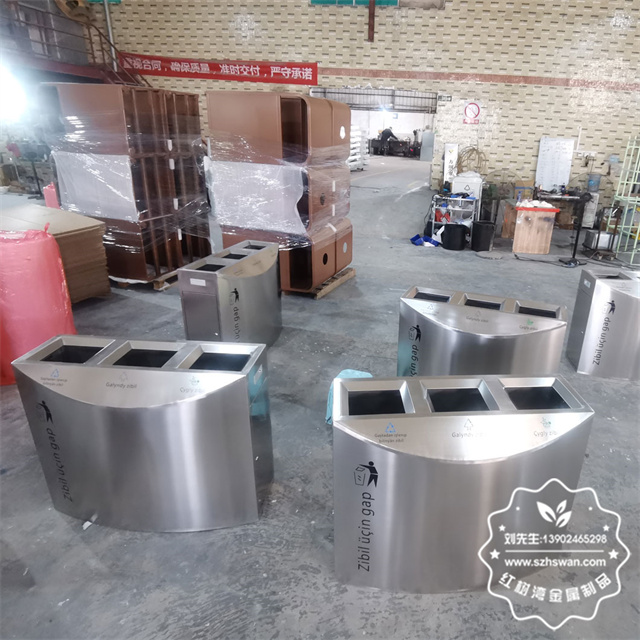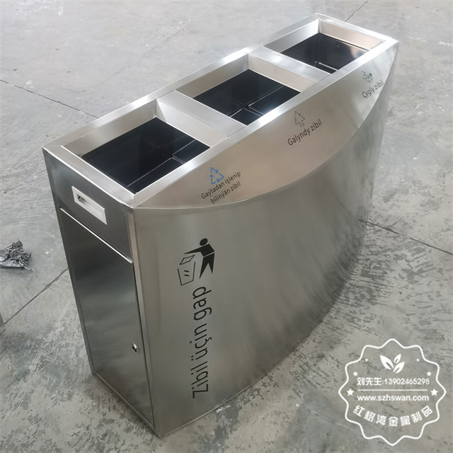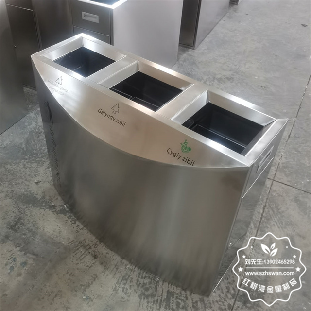 產品材質:室內商用三分類連體不銹鋼垃圾桶采用201#,202#,304#優質不銹鋼材料模壓成型,堅固耐用;內外表面光潔,減少垃圾殘留,易于清潔;配置鍍鋅板內桶,便于垃圾清倒;