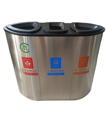 產品材質:機場商場室內三分類不銹鋼垃圾桶采用201#,202#,304#優質不銹鋼材料模壓成型,堅固耐用;內外表面光潔,減少垃圾殘留,易于清潔;配置鍍鋅板內桶,便于垃圾清倒;